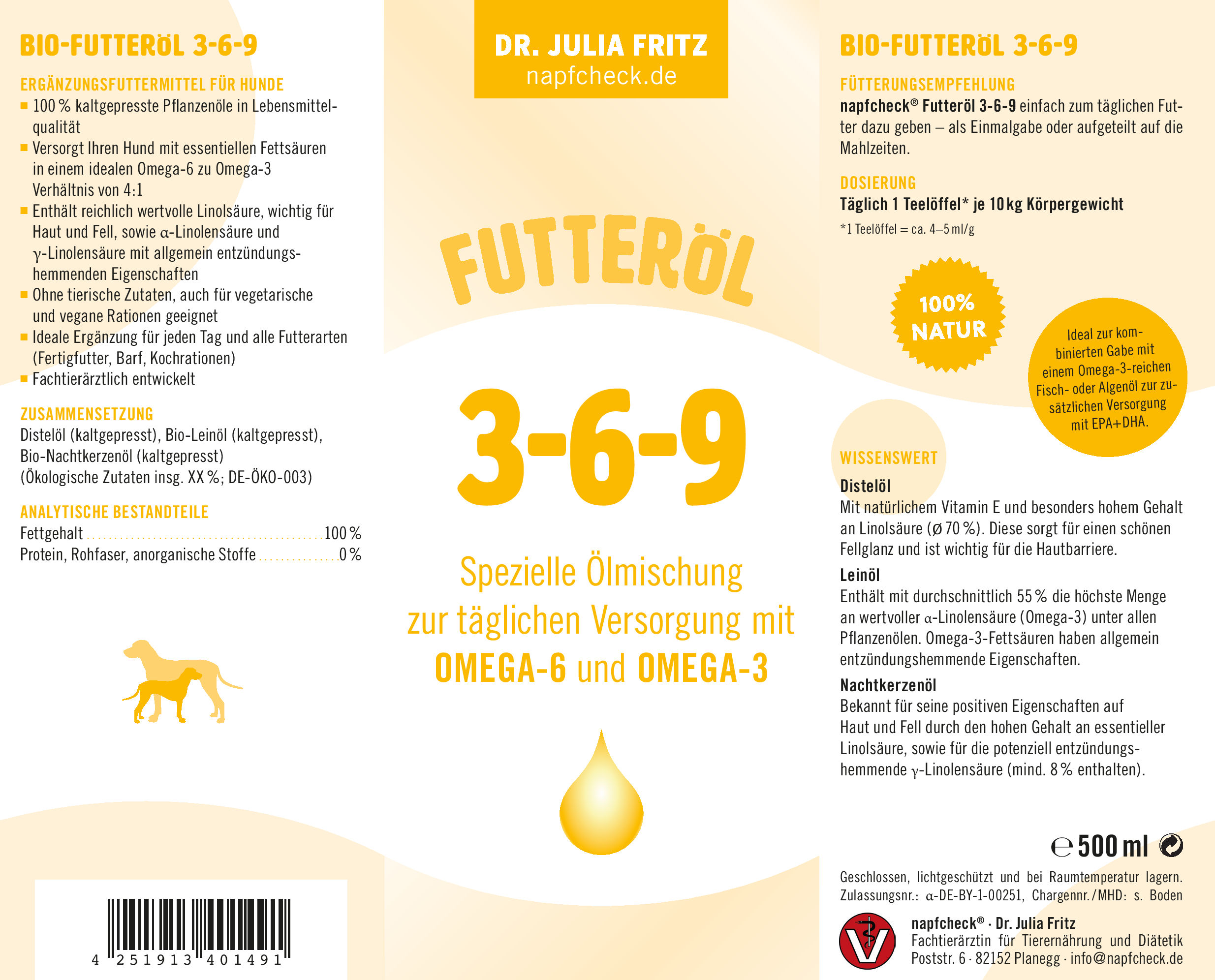 napfcheck Futteröl 3-6-9 einfach zum täglichen Futter dazu geben – als Einmalgabe oder aufgeteilt auf die Mahlzeiten. Als Ergänzung für Trocken- und Nassfutter sowie Barf- und Kochrationen geeignet.