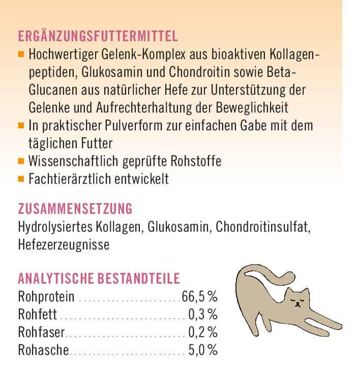 Kollagen, Glukosamin und Chondroitin sind natürliche Bestandteile von Knorpel, Gelenkflüssigkeit und Bindegewebe und spielen eine zentrale Rolle für die Stabilität und Elastizität der Gelenke. Bei Gelenkproblemen können sie dazu beitragen, den Knorpelstoffwechsel zu unterstützen, Entzündungen abzumildern und die Beweglichkeit der Katze zu fördern.